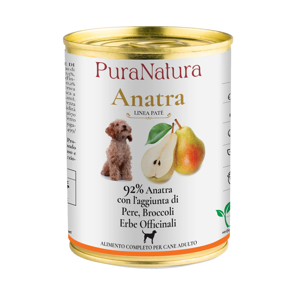 Il Paté Adult Anatra e Pere della linea Puranatura è un pasto completo e naturale per cani adulti, studiato per offrire gusto, digeribilità e nutrizione bilanciata. La carne d’anatra, pregiata e altamente appetibile, si combina alla dolcezza della pera per un’alimentazione sana e funzionale.